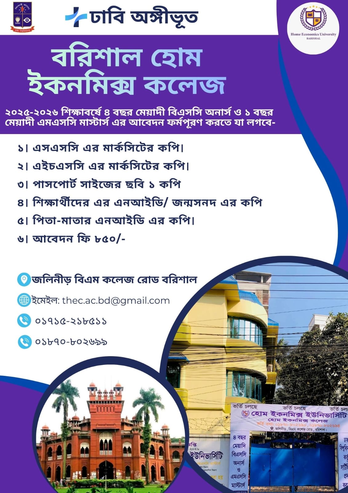 গতানুগতিক শিক্ষার স্থলে কর্ম ও জীবনমুখি শিক্ষার প্রসার ঘটিয়ে বেকাত্বকে দূর করার উদ্দেশ্যে নিয়ে ২০২০ সালে প্রতিষ্ঠা করা হয় ‘বরিশাল হোম ইকনমিক্স কলেজ’ যা ‘ঢাকা বিশ্ববিদ্যালয়’ এর কর্তৃপক্ষ ইতোমধ্যে তাদের উপাদানকল্প কলেজ হিসাবে অনুমোদন প্রদান করেছেন। শিক্ষার্থীদের কথা বিবেচনা করে এখানে যে সকল সুবিধা বিদ্যমান রয়েছে সেগুলো হলো আধুনিক সুপরিসর ল্যাব, এসি ক্লাসরুম, অভিজ্ঞ ও মেধাবী শিক্ষকমন্ডলী, ২৪ ঘন্টা বিদ্যুৎ সরবরাহ, খোলামেলা অপর ...